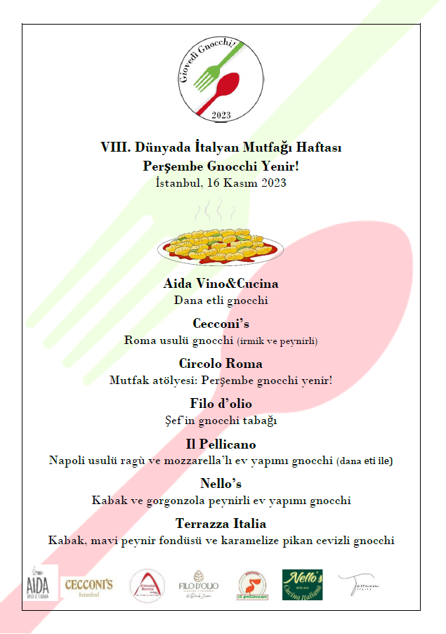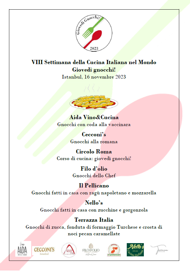 Program kapsamında, İtalyan Ticaret ve Sanayi Odası tarafından basına sunulan bir öğle yemeğinin yanısıra, Gastronometro ve Şef Samuele Zaninotto ile işbirliği içinde, Mutfak Akademileri öğrencilerine yönelik bir Masterclass/Workshop ve sektör temsilcileri için bir akşam yemeği yer alacaktır. Bunun yanında, İtalyan Kültür Merkezi ile birlikte Lorenza Scalisi, Chiara Cadeddu ve Şef Fabrizio Boca’nın “Başkanların tüm yemekleri” başlıklı kitabının tanıtımı ve son olarak İtalyan İşçi ve Yardımlaşma Cemiyeti ile işbirliği içinde basın, kurumlar ve iş dünyasına yönelik “Aperitivo all’Italiana” etkinliği gerçekleştirilecektir. 16 Kasım tarihinde ise Aida Vino e Cucina, Cecconi’s, Filo d’Olio, Il Pellicano, Nello’s, Terrazza Italia ve Circolo Roma restoranları, İstanbul İtalya Başkonsolosluğu ile birlikte, ‘Giovedì Gnocchi’ (“Perşembe Gnocchi Yenir!”) geleneğini yaşatmak adına, menüde yer almayan ‘gnocchi’ yemeği sunacaklardır. 9 Aralık tarihinde, İstanbul İtalya Başkonsolosluğu, Türkiye’deki İtalyan şirketleriyle işbirliği içinde, Circolo Roma’nın ‘Portobello’ pazarına katılacaktır. Bağışlanan ürünler satılacak ve elde edilen gelir İtalyan Hayır Derneği’ne bağışlanacaktır.